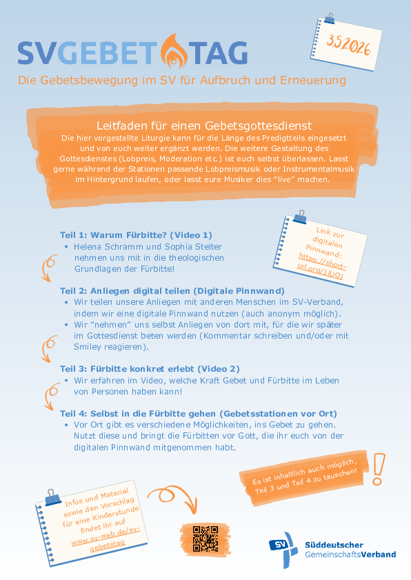 Der Gebetstag wird vor Ort in den Gemeinden durchgeführt. Folgende Gestaltungselemente können individuell verwendet werden. Weitere Informationen bekommst du bei deinem Pastor oder Gemeindeleiter.